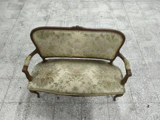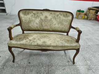 Conjunto de sofá de 3 plazas y 2 sillones antiguos, apenas han sido usados, están en perfecto estado, ideales para dar un toque clásico a tu salón. Incluye mesa de centro también de madera Oportunidad!!!!! todo por tan solo 120€ - Tapicería de tela con diseño. - Estructura de madera visible en los brazos.