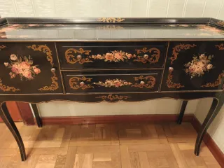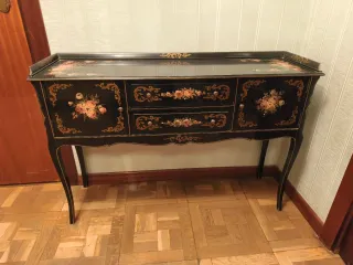 Mueble auxiliar con más de 50 años de antigüedad, con un diseño elegante y detallado. - Acabado principal en negro con detalles dorados. - Pintura decorativa floral. - Patas curvas de estilo clásico.