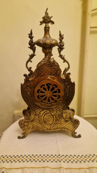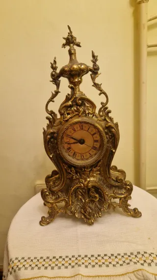 Elegante reloj de mesa con un diseño ornamentado y detalles intrincados. Altura: 45 cm - Acabado en tono dorado y marrón. - Fabricado en metal resistente.