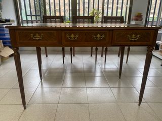Elegante mesa de escritorio de estilo antiguo. Su diseño combina la calidez de la madera con detalles en cuero. - Tres cajones frontales con tiradores dorados. - Patas torneadas con un acabado clásico. - Diseño con incrustaciones de madera.