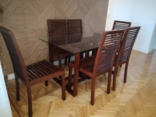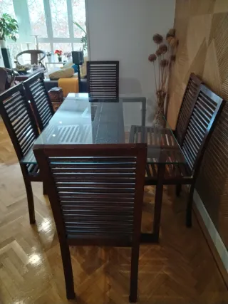 Conjunto de mesa con sobre de cristal y seis sillas de madera de la marca Banak. - Mesa con estructura de madera y tapa de cristal. - Seis sillas de madera con diseño de lamas. Una de ellas esta reforzada, como se puede ver en la foto, pero las demás están en perfecto estado
