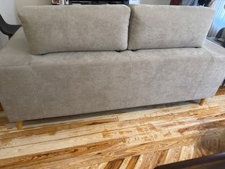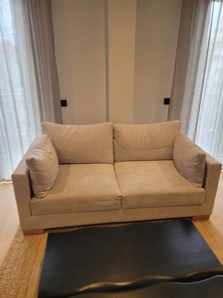 Sofá de tres plazas de la marca Banak, modelo Jagger. De estilo nórdico con tapicería de tejido antimanchas beige y patas de metal de color negro. Los cojines de respaldo y el asiento son desenfundables. Un mueble cómodo y elegante, con un diseño moderno para tu salón. Materiales: Madera de pino y tablero de partículas. Metal. Tejido - Completamente nuevo, lo tenemos protegido con una funda para que no se ensucie. - Lo vendemos porque nos queremos comprar otro más grande. - Disponible para recoger en Marzo - Cojines decorativos no incluidos Medidas: Ancho 212 cm, Fondo 90 cm, Alto 105 cm