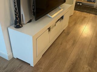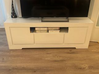 Mueble de televisión de Banak de 160 cm de ancho. Diseño moderno y funcional. - Amplio espacio de almacenamiento. - Acabado en blanco. Tiene algún desperfecto por la mudanza.