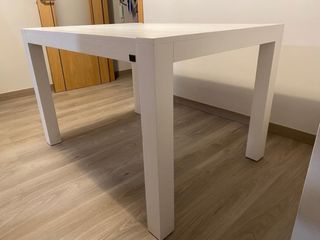 Preciosa mesa de comedor rectangular extensible, ideal para cualquier hogar. Se encuentra en perfecto estado y lista para usar. - Medidas: 120cm (cerrada) / 180cm (abierta) - Acabado en lacado blanco brillante - Diseño elegante y minimalista