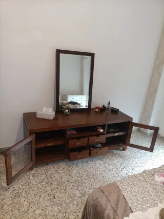 Mueble bajo de estilo colonial de la marca Banak. - Acabado en madera oscura. - Puertas con cristal. - Diseño espacioso con cajones y compartimentos. Sin el espejo. Alto 60 Largo 1'60 Profundidad 55