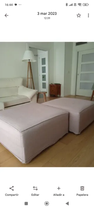 Par de reposapiés Banak en tela. Color rosa cuarzo. Muy robustos. 40 euros cada uno. Con muy poco uso. Medidas 90x90 CMS. - Color beige y rosa. - Diseño moderno y cómodo.
