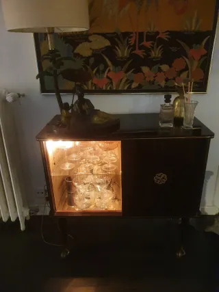 Este mueble es una pieza fascinante de diseño Mid-Century Modern, muy probablemente de fabricación española de las décadas de 1960 o principios de los 70. Es lo que tradicionalmente se conocía como un "mueble bar" o aparador de salón de alta gama de la época.