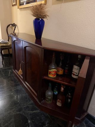 Mueble de comedor de madera con espacio de bar integrado. Ideal para salones o comedores. Medidas 1,60 de largo x 0,40 cms de fondo - Acabado en madera oscura. - Compartimentos de almacenaje. - Diseño clásico.