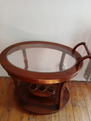 Carrito camarera con ruedas antiguo. Madera con marquetería y parte superior de cristal. Excelente estado, apenas unos minúsculos rocecitos.