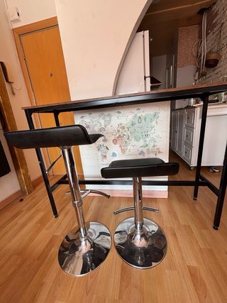 Conjunto de mesa de bar con dos taburetes. - Mesa con superficie de madera. - Taburetes con asiento de piel sintética. - Base de los taburetes de metal.