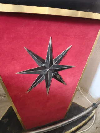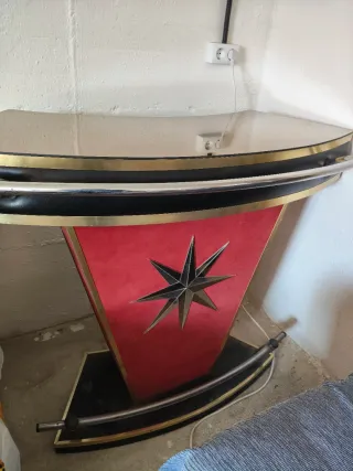 Elegante barra de cóctel de estilo vintage con un diseño llamativo. Pieza única. - Superficie superior de cristal. (Solo con un pequeño desperfecte, ver foto) - Detalles en metal dorado. - Revestimiento principal en terciopelo rojo. - Base con acabado en negro. En Bueno estado, solo falta limpieza. No tengo prisa por vender. Abstenerse ofertes absurdas.