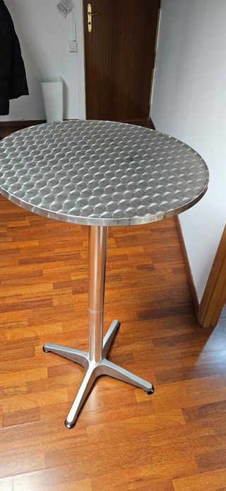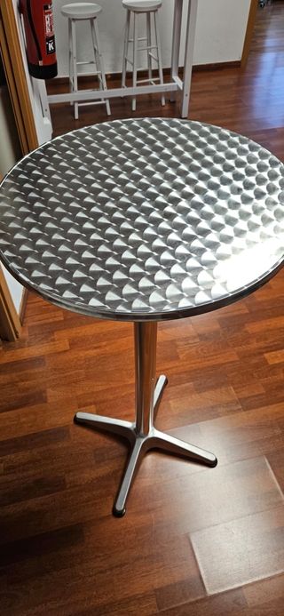 Mesa de bar con un diseño moderno y funcional. Su base central proporciona estabilidad y un estilo distintivo. - Tablero de madera con acabado beige. - Base de metal plateado. - medidas : 70x70 - Hay 2 unidades , precio por unidad
