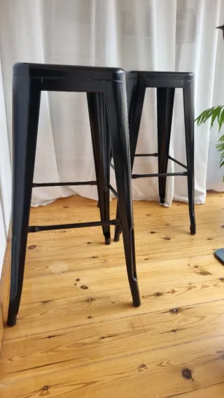 Disponibles dos (2x) taburetes para barra. Material - acero Color - negro Altura - 77cm Superifcie silla - 30x30cm Precio individual - 40€ Precio para los dos - 50€ total ENGLISH: Two (2x) bar stools Material: Steel Color: Black Height: 77 cm Seat Surface: 30x30cm Price for one - 40€ Price for the two stools - 50€ total