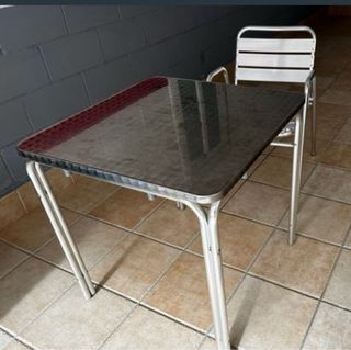 Conjunto de mesas y sillas de bar con un diseño moderno y funcional. - Mesas cuadradas con superficie texturizada. - Patas metálicas resistentes y estables. - Sillas apilables para optimizar espacio.precio por juego 1 mesa 3 sillas 40€