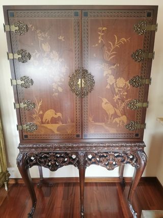 Precioso gabinete bar antiguo en madera con marquetería, por dentro está todo acristalado como se puede ver en las fotos. No tiene roces, está en perfecto estado. Medidas: 180cm de altura x 110cm de ancho y 50cm de fondo. Ver más cosas en mi perfil.