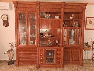 Mueble modular de Salón completo en madera de Cerezo. 2 módulos estantes, uno de ellos con cristalera y puerta, mueble TV movible con ruedas, cajonera y vitrina y mueble bar espectacular. En muy buen estado solo algún pequeño roce del tiempo casi imperceptible. 2700 euros su precio de compra. Guardo factura. Para medidas y detalles, preguntar.