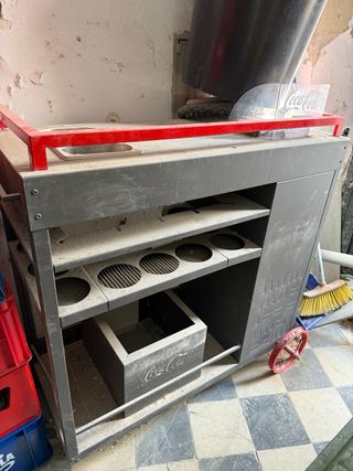 Carrito bar de Coca-Cola, perfecto para eventos. Se encuentra algo polvoriento, pero en general está en buen estado. - Contiene dos cubetas de acero inoxidable. - Dispone de varias ranuras para vasos. - Incluye una bandeja inferior.