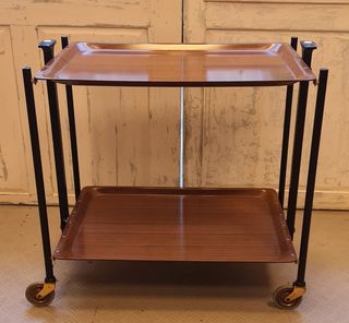 Vintage - Muebles Carrito de servicio vintage, carrito de bar, carrito, carrito de té, mesa rodante Gerlinol Dinett No18, años 60s o 70s Alemania. Modelo Dinett de Bremshey: El carro de servicio de dos niveles con tableros de resina sintética (Gerlinol) con apariencia de madera veteada (similar al nogal o la teca), la estructura tubular negra y el mecanismo de plegado rápido son las características distintivas del icónico modelo Dinett fabricado por Bremshey & Co. en Solingen, Alemania. Estos carros fueron muy populares desde finales de los años 50 hasta los 70. 2025-AMU0338