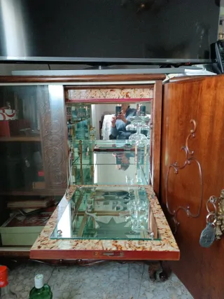 Este mueble bar de pared antiguo añade un toque de elegancia a cualquier espacio. - Diseño de madera con detalles en metal dorado. - Estantes para copas de cristal. - Compartimentos inferiores para almacenamiento.