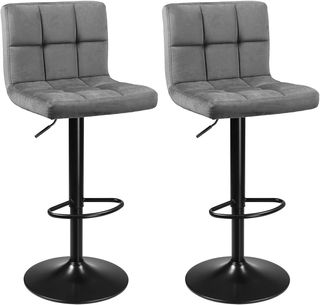 Crea un acogedor rinconcito para el desayuno con el set de 2 taburetes de bar Songmics. Acolchados con espuma de 6 cm y revestidos en terciopelo de calidad, ofrecen comodidad y estilo. La altura es regulable y el respaldo con reposapiés permite una pausa relajante. La estructura de metal pintado en polvo y la base ampliada (diámetro de 41 cm) garantizan una capacidad de carga de 120 kg por taburete, asegurando estabilidad. Fácil de ensamblar con solo 4 tornillos y 3 pasos, este set elegante enriquece tu comedor con una atmósfera de bar.
