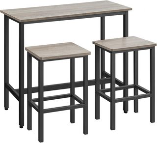 Este conjunto de mesa y taburetes es ideal para desayunos y bebidas con amigos. La mesa alta (100 x 40 x 90 cm) y los dos taburetes (40 x 30 x 65 cm) ofrecen espacio y comodidad. Fabricado en aglomerado de calidad y acero, el conjunto tiene un acabado greige melange y negro tinta. Cada taburete soporta hasta 100 kg. Incluye un kit antirrobo para la seguridad y patas ajustables para estabilidad en suelos irregulares. Contenido: 1 mesa, 2 taburetes, manual de instrucciones, bolsa con herramientas de montaje. Montaje simple y rápido, perfecto para cualquier ambiente.