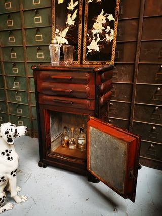 Instagram janoradeco Espectacular pieza. Vintage. Elegante mueble bar de estilo oriental. Muy buena calidad. Muy decorativo. Mucho almacenaje. Señales de uso. Medidas cerrado 46 x 94 y 108 de alto. - Acabado en negro con detalles multicolores. - Decorado con escenas orientales. - Incorpora un espejo en la superficie superior.