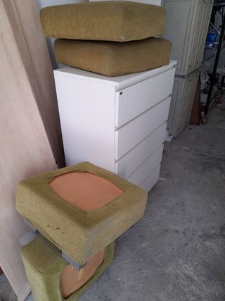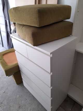 3 almohadas de asiento sofa=30 euros cada. 1 silla=15 euros 1 cómoda = 70 euros. Estanteria=50 euros Todo está en muy buen estado tal y como se vé en las imágenes.El armario lo volveriamos a montar de antemano al que le interese. Solo venta presencial y en torre Baró.