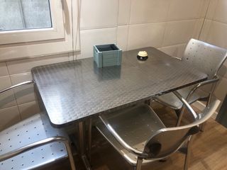 mesa de cocina y sillas de la casa Vinçon la mesa mide 100x69x74 alto y las sillas de inox a conjunto vendo el conjunto entero 1 mesa y 4 sillas