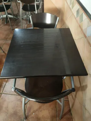 Mesa cuadrada de bar con dos sillas. Son perfectas para un espacio reducido. ( 6 mesa 12 sillas) - Estructura metálica. - Tapas de madera. - En buen estado.