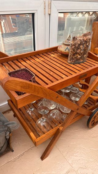 Carrito bar con un diseño elegante y funcional, perfecto para servir bebidas y aperitivos. - Estructura principal de madera. - Bandejas con listones de madera. - Ruedas para facilitar el desplazamiento. - Soporte para copas en la bandeja inferior.
