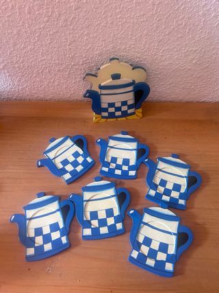 Juego de seis posavasos de madera pintados a mano con forma de cafetera. Son ideales para proteger tus muebles y añadir un toque de estilo a tu cocina. - Seis posavasos con diseño de cafetera. - Color azul y blanco. - Material: madera. - Pintados a mano. - Diseño de cuadros.