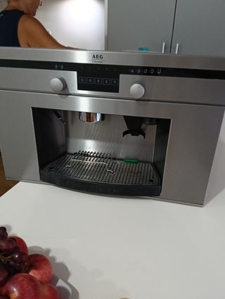 Cafetera integrable de la marca AEG, diseñada para empotrar en muebles de cocina. Su acabado metálico le da un toque moderno. - Diseño elegante para cocina. - Panel de control con botones. - Bandeja recogegotas extraíble.