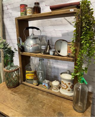 Bonito mueblecito de cocina con 3 estanterías. El precio es por el mueble. Pregunta por la disponibilidad del resto de artículos de atrezo de la foto. 32cm entre balda y balda. casa, campo, rural, rústico, rústica, alquiler, decoración, vacacional, turismo, cocina, comedor, librería, damajuana, botellas antiguas, sifón, lata, embudo, blanco, porcelana, vintage, antigüedades, aceite oliva, águila dorada, gaseosa Martínez, tetera, cafetera, molinillo, mobiliario, atrezo, hostelería, cafetería