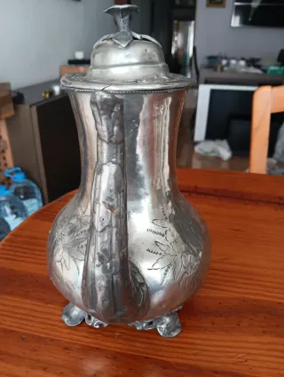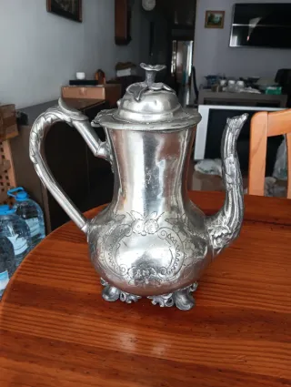 Elegante cafetera antigua de en plata con un diseño detallado y ornamentado. Su acabado metálico le confiere un aspecto clásico y distinguido. - Piezas decorativas en relieve. - Base con patas. - Asa curva y pico vertedor.