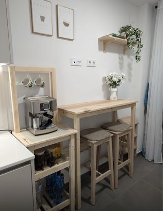 Conjunto de dos mesas de madera, una alta y otra para máquina de café. - Mesa alta con diseño moderno. - Mesa auxiliar para cafetera con estantes. No vendo las sillas, las escaleras ni la cafetera.