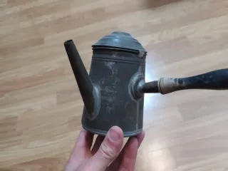 Cafetera antigua con un diseño clásico y funcional. - Cuerpo principal fabricado en metal. - Mango ergonómico de madera.