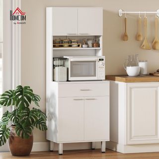 Credenza Cocina Alta Con 2 Armarios, Mesa Para Microondas Y Cajón, Mueble Despensa Con Puertas De Vidrio Y Estantes Regulables, Para Sala De Estar, Comedor Y Cocina, 80X48X170 Cm, Blanco
