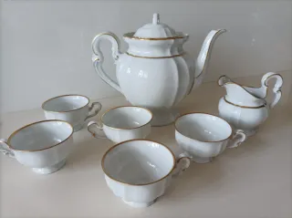 Elegante juego de café de porcelana con detalles dorados. - Cafetera - Azucarero - Lechera - 3 tazas con sus platos