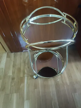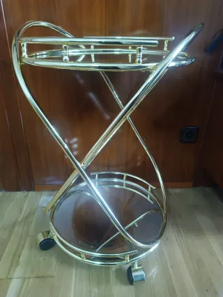 Elegante camarera con estructura metálica y bandejas de cristal. - Diseño de dos niveles. - Ruedas para fácil movilidad. - Acabado dorado. La camarera está en Morata de Tajuña y se puede entregar en Arganda del Rey, Rivas-Vaciamadrid y Madrid.