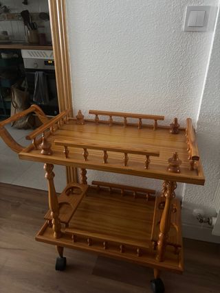 Elegante carrito camarera con un diseño clásico y funcional. Ideal para servir o como mueble auxiliar. - Estructura de madera robusta. - Tres niveles para mayor capacidad. - Ruedas para fácil movilidad. - Detalle decorativo en la bandeja superior. - Cesta lateral integrada. Tiene algunos arañazos en la bandeja superior como muestran las fotos y le falta una pieza de madera del botellero. Solo entrega en persona