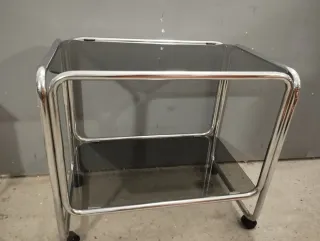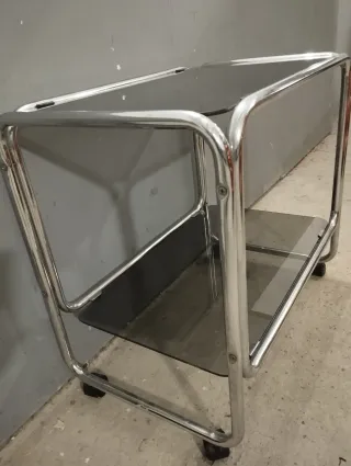 camarera carrito mueble auxiliar vintage en acero y cristal con mucho estilo para botellas, juego de café en acero, tv, música... firma miguelez