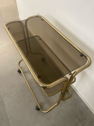 ESCUCHO OFERTAS Camarera vintage con estilo mid-century. Estructura metálica dorada y dos baldas de cristal ahumado. Le falta el cristal inferior. Ideal como mueble bar, mesa auxiliar o para decorar cualquier rincón . Tiene ruedas y está en buen estado. Medidas aproximadas: 84x45x74 cm Se entrega en Valencia capital. También puedo acercarla si estás cerca.