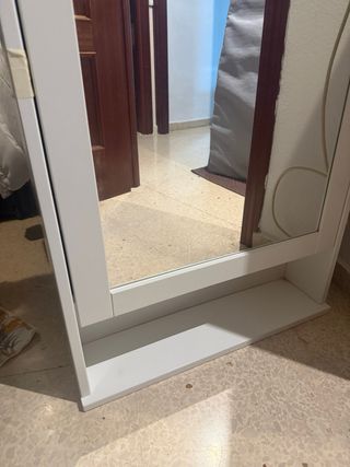Mueble de baño con espejo. - Marco de madera blanco. - Espejo de cristal. - Detalles metálicos y de plástico. -Estanterias internas de cristal.