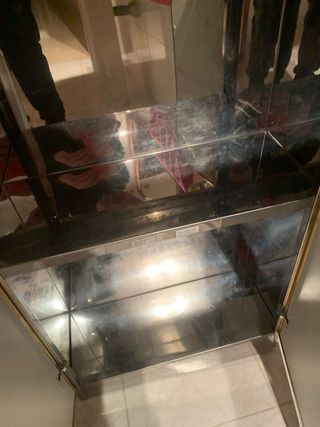 Módulo mueble baño para colgar. Sin estrenar, no se ha llegado a colgar. Color negro lacado brillo, la puerta frontal tiene efecto de purpurina. Se abre con tirador de acero que va en la parte de abajo a lo ancho de la puerta. Me costó 180 euros.