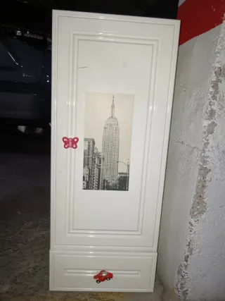 Mueble de baño con un diseño moderno y práctico. Cuenta con un cajón en la parte inferior para almacenamiento adicional. - Acabado blanco brillante. - Tirador en forma de coche rojo. - Adorno de mariposa roja. - Imagen decorativa del Empire State Building.