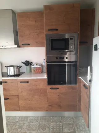 Se vende cocina completa disponible en abril por reforma. Desmontaje y retirada a cargo del comprador. Incluye • Mobiliario de cocina en color cerezo, acabado en chapa de madera • Encimera de mármol • Hueco para nevera No incluye • Electrodomésticos (venta aparte-ver anuncios) Medidas • Ancho total: 381 cm + hueco para nevera • Profundidad: 60 cm y 34 cm según módulos Materiales y color • Color: cerezo y algún detalle verde • Material: chapa de madera