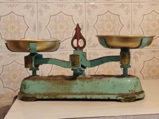 Balanza de cocina vintage con un diseño clásico. - Bandejas doradas. - Estructura de metal en color verde azulado.