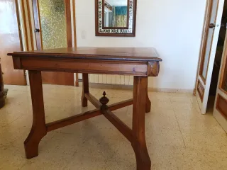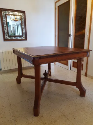 Mesa de madera con un diseño rústico, perfecta para cocinas o comedores con un toque tradicional. - Estructura robusta y estable. - Acabado en tono madera natural. - Patas con diseño curvo y un travesaño central decorativo. Consta de 2 piezas: el pie y el sobre. Presenta signos de carcoma sólo en el pie ya tratada y NO activa. Recogida en Blanes ( Costa Blava ). Cabe en el ascensor. También tengo espejo biselado muy bonito. Antigüedad, antiguo, interiorismo, campo, rústico, decoración, colonial, rural, urge, oferta
