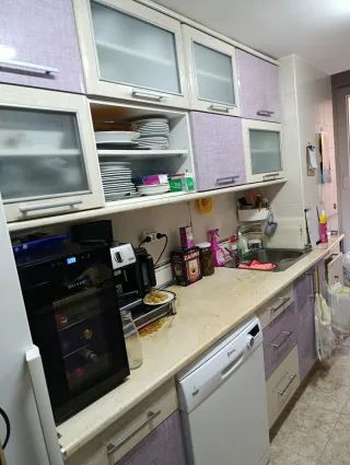 Conjunto de muebles de cocina en tonos beige y morado. No incluye electrodomésticos. Si incluye fregadero. El lado del fregadero mide 2.80 de largo por 0.60 de ancho y el lado contrario 2.25 de largo mas 1.45 de los muebles con menos fondo. Los muebles por dentro estan en perfecto estado y completamente limpios, importante!! Materiales de calidad. La cocina está desmontada, solo para llevársela. La cocina está en Loeches.