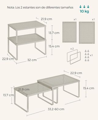 SONGMICS Estante para Especias, Juego de 2, Organizador de Armario, Estante de Almacenamiento de Cocina Extensible, Especiero de Metal y Madera, Beige Travertino y Blanco Crema KCS020L01 MaterialBeige Travertino, Blanco Crema ColorBeige Travertino + Blanco Crema Función especialAjustable Dimensiones del producto19,6f. x 29,7an. x 15,7al. centímetros Tipo de estanteEstante sólido Número de estantes2 [Almacenamiento] Estos estantes de cocina mantienen tus cosas organizadas y al alcance de la mano, ya sean especias, recipientes, latas, cubiertos o recetas. También se pueden utilizar como mesitas para gatos [Resistentes y durader...